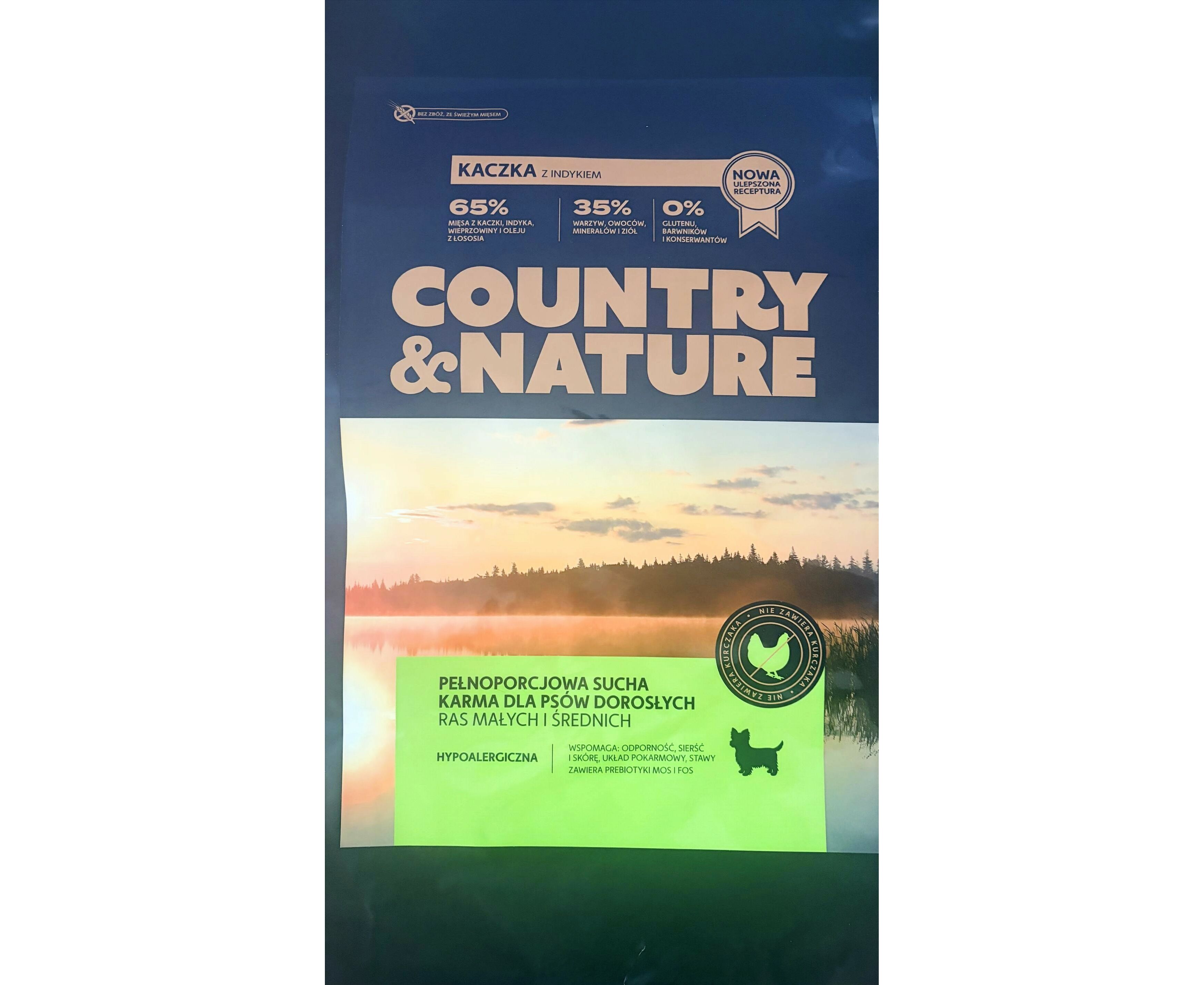 Karma COUNTRY&NATURE Kaczka z Indykiem to pełnoporcjowa sucha karma dla psów dorosłych ras małych i średnich.