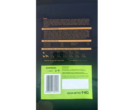 Kaczka 31% (18% kaczka świeża, 13% kaczka suszona), 22% indyk suszony, ziemniaki, bataty, olej z łososia 8%, jabłka suszone, wysłodki buraczane, wieprzowina, siemię lniane, substancje mineralne, drożdże hydrolizowane, glukozamina, żurawina suszona, chondroityna, mannooligosacharydy (MOS), ziele pokrzywy, produkty drożdży (postbiotyczne drożdże Saccharomyces cerevisiae i Cyberlindnera jadinii), metolosulfonylometan (MSM), cykoria suszona, Yucca Schidigera