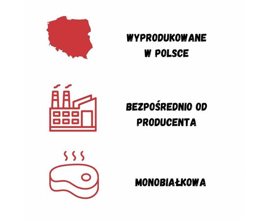 Przy produkcji nie używamy żadnych mączek mięsnych, kości czy piór. Dbamy o to co jest w środku karmy, czyli tylko mięso mięśniowe i podroby - idealne źródło białka i mikroskładników odżywczych.